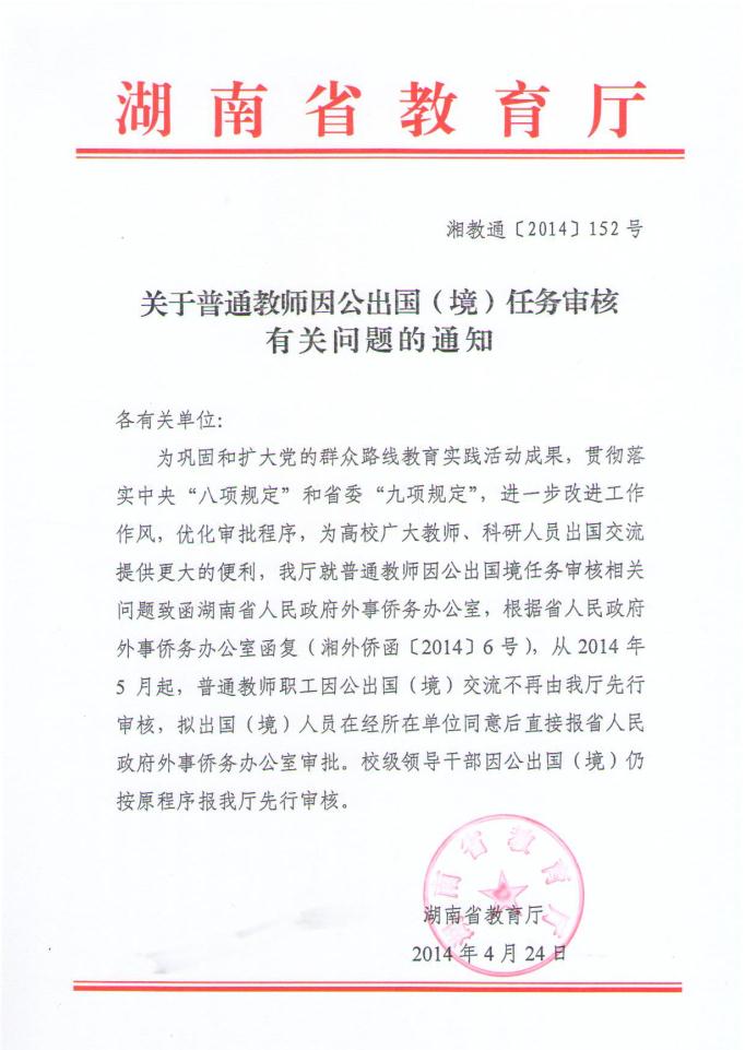 现将湖南省教育厅《关于普通教师因公出国(境)任务审核有关问题的通知》转发给你们,请认真传阅。
