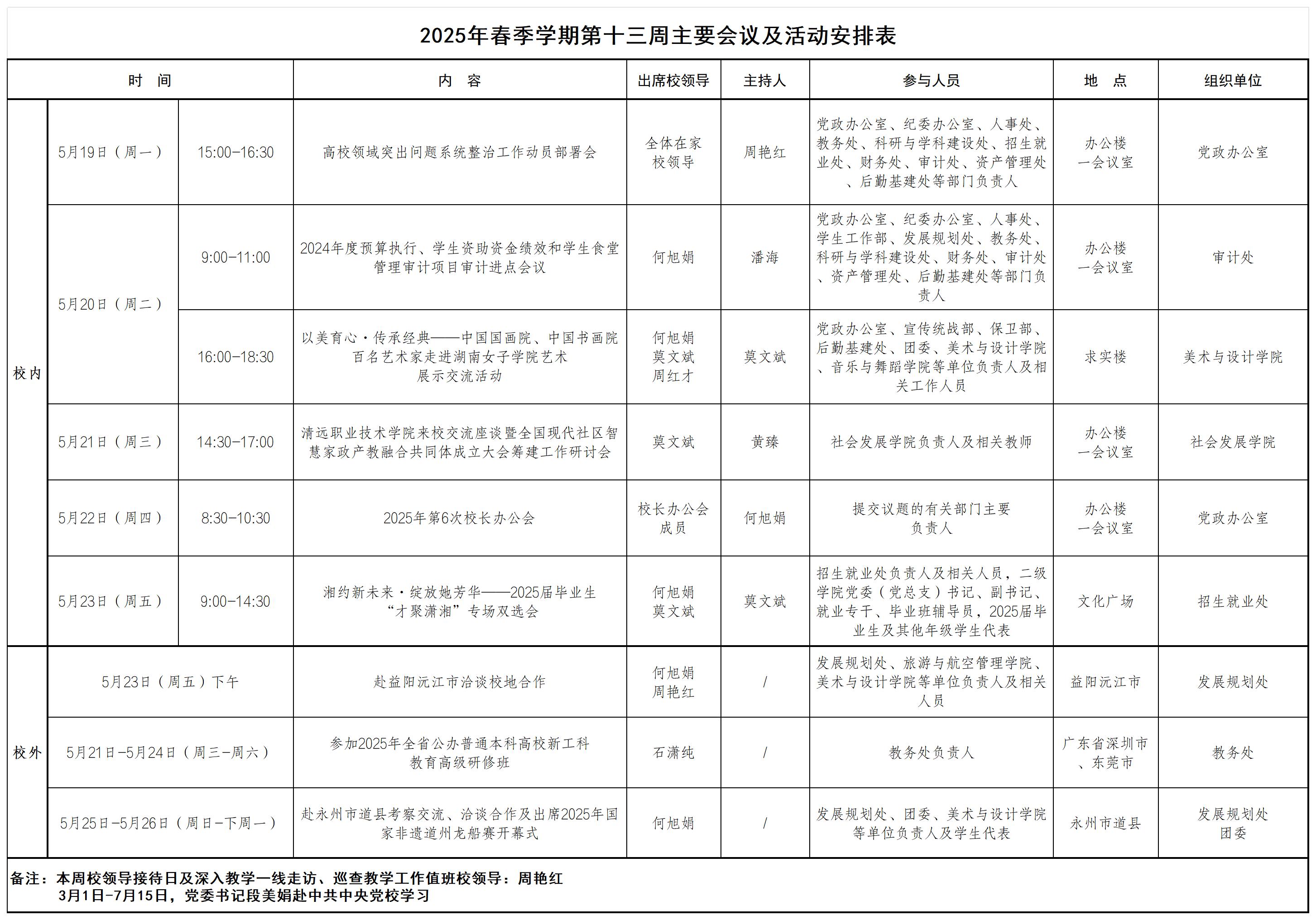 2025年春季学期第十三周主要会议及活动安排