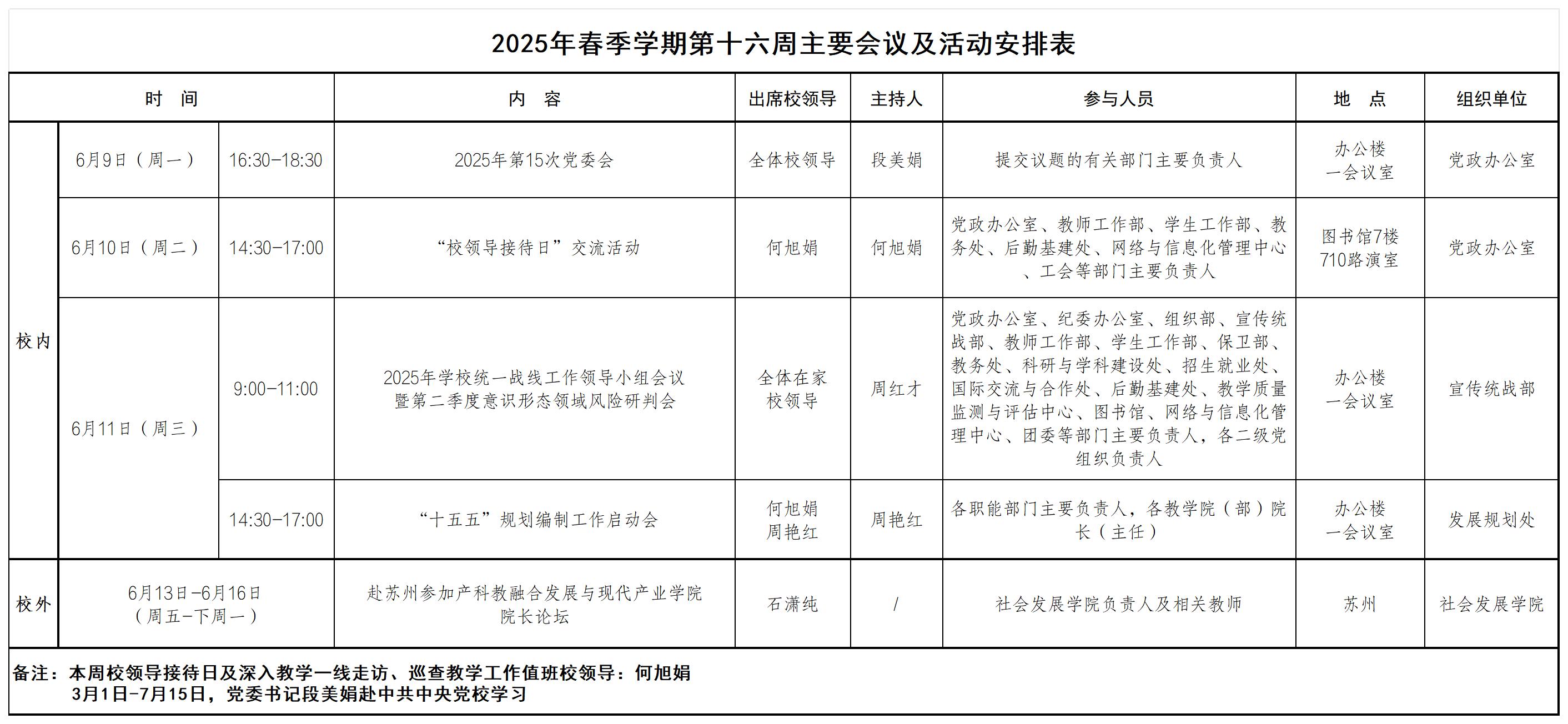 2025年春季学期第十六周主要会议及活动安排