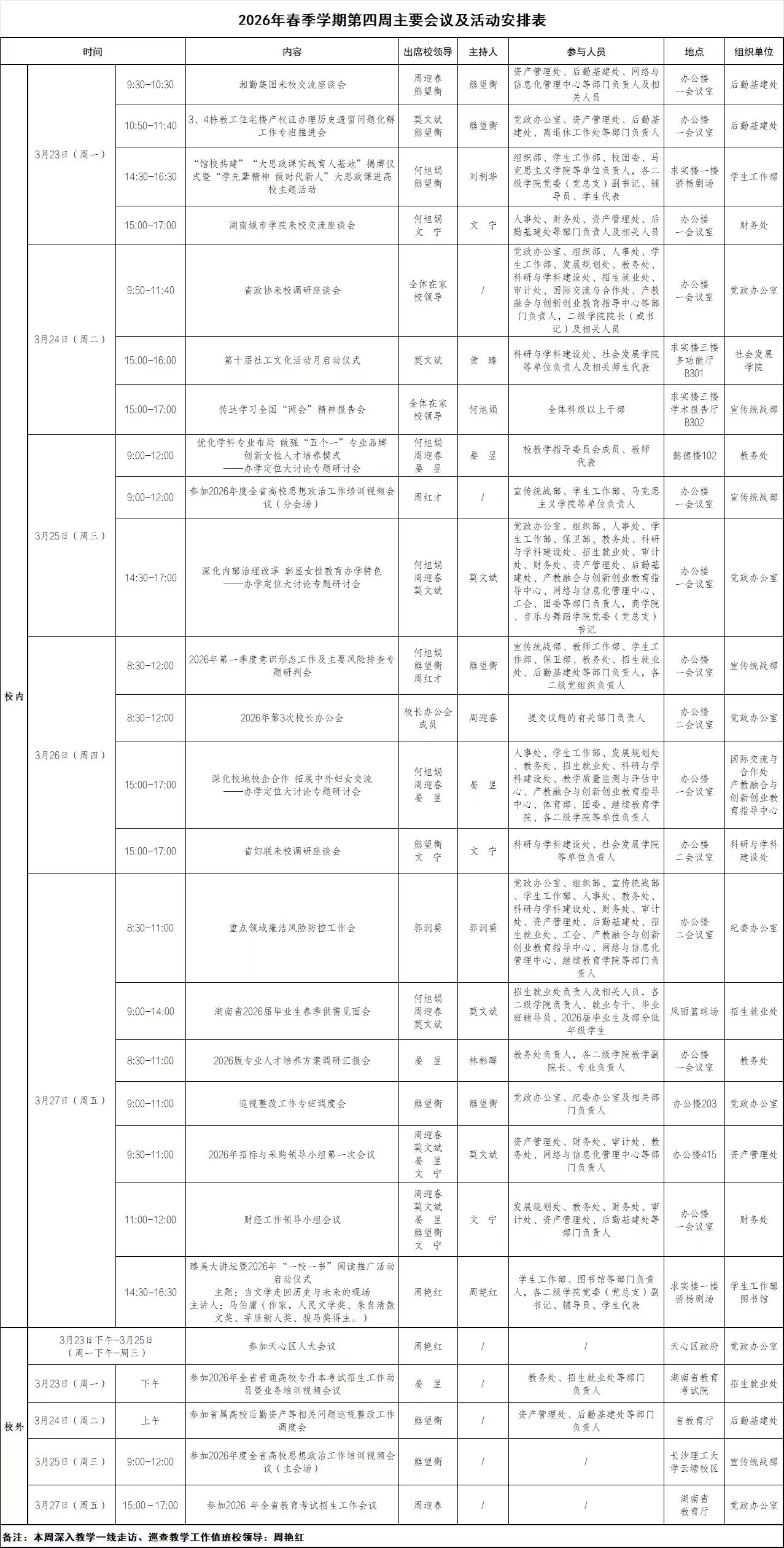 2026年春季学期第四周主要会议及活动安排