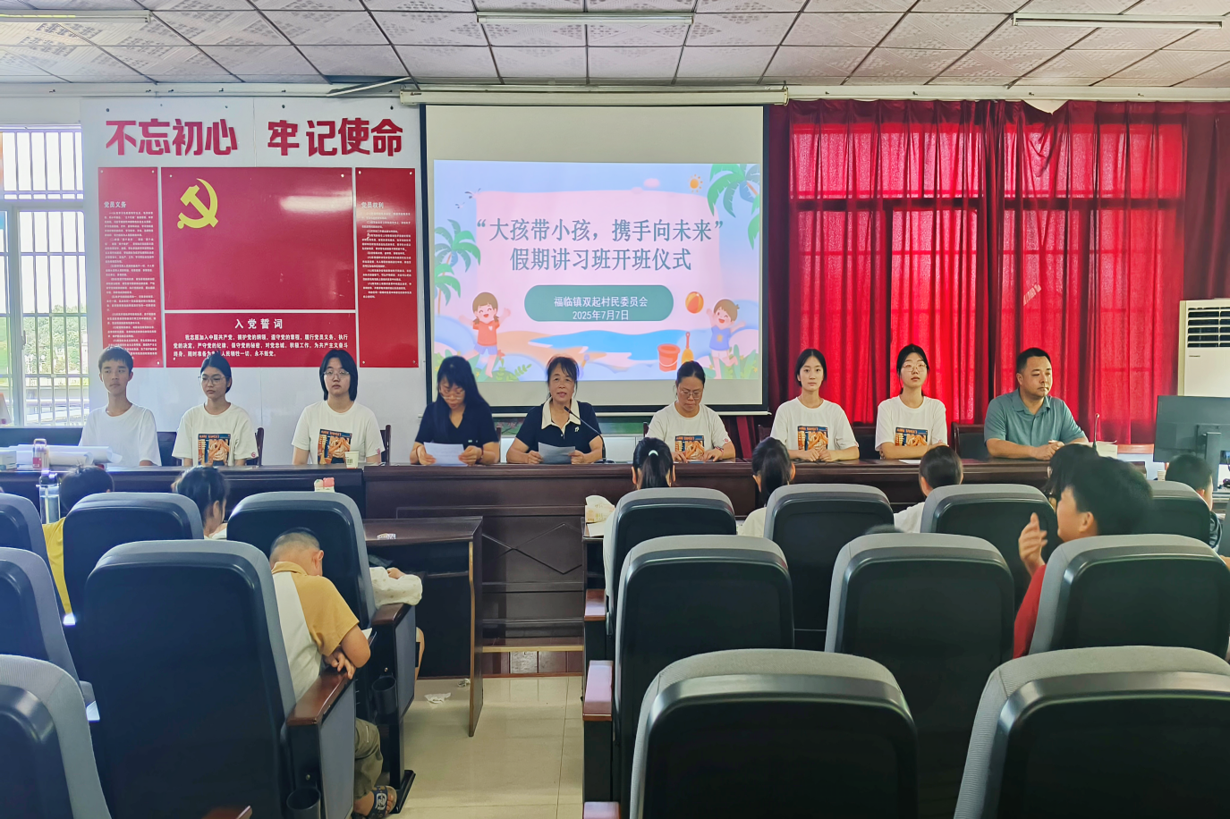 本网讯(旅游与航空管理学院 段佳毅 商学院 周怡)7月7日,best365官网微拾光——萱草宝贝成长陪伴计划公益团队来到长沙县福临镇双起村,开展为期六天的暑期社会实践活动。双起村支部书记黄宇、长沙县树湘公益负责人吴炯及项目指导老师和9名团队成员参加了“大孩带小孩 携手向未来”假期讲习班开班仪式。村支两委对培训班做了纪律和安全要求。