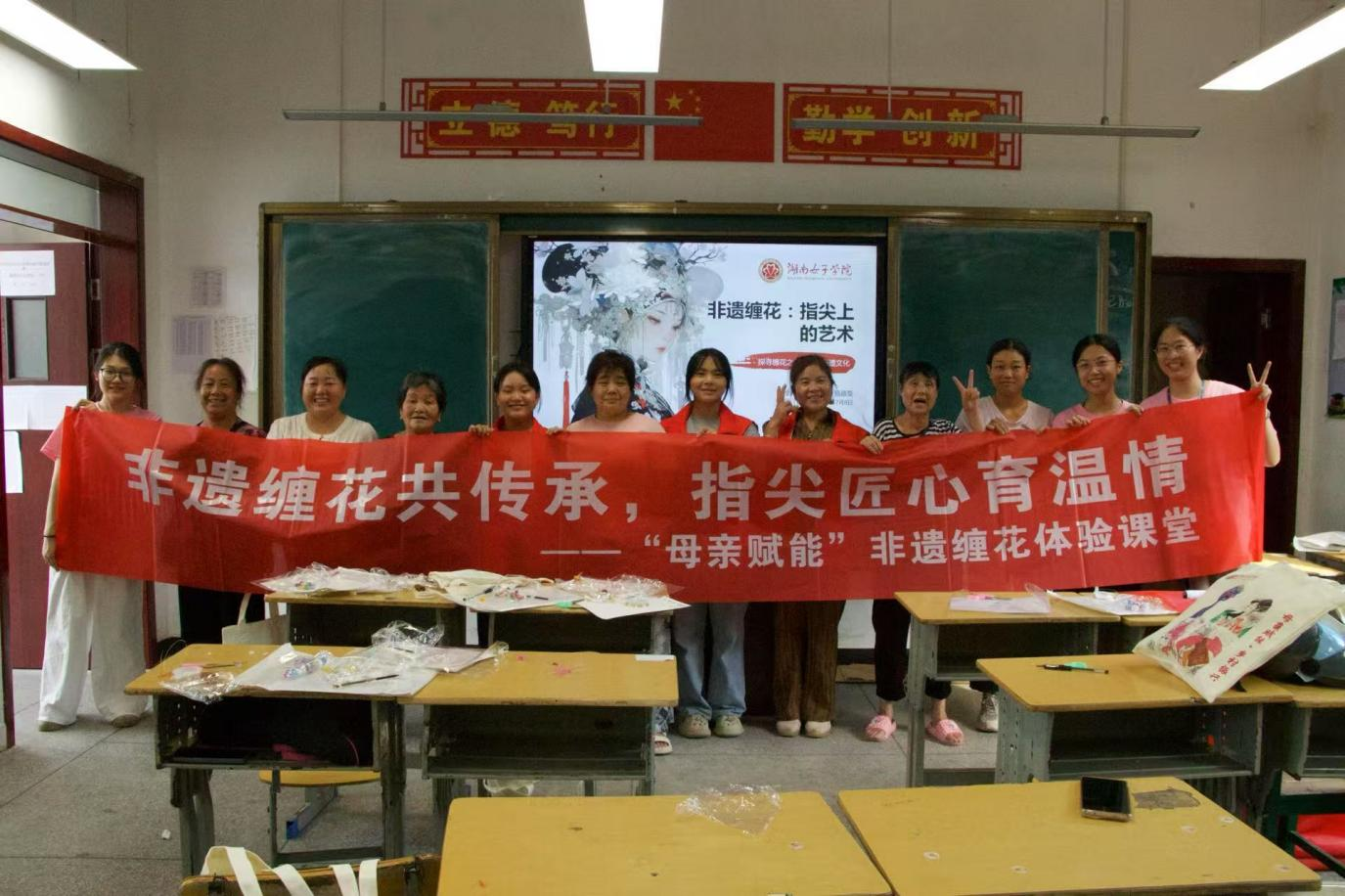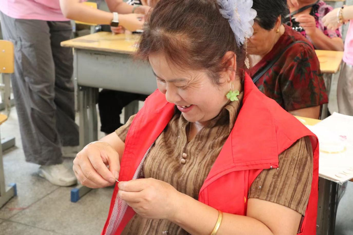 实践环节,竹木骨架在母亲们手中渐显雏形,五彩丝线缠绕出朵朵生机。当一朵朵精致的缠花在指尖绽放,母亲们成就感盈溢其间。村民王大姐捧着亲手制作的缠花发簪笑道:“这辈子没做过这么美的东西,咱也能成‘手艺人’了。”大家围坐热议着如何将缠花融入日常,现场暖意融融。课程尾声,母亲们佩戴着亲手制作的缠花合影,鬓边的花朵与眼中的笑意相映生辉,定格下温情瞬间。
