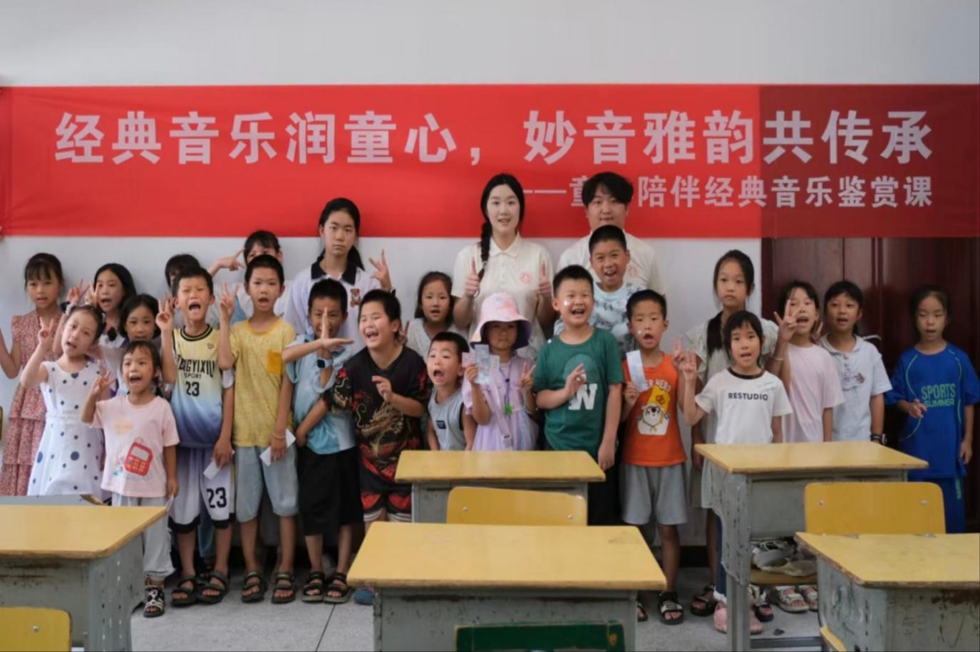 音乐课堂上,实践团成员化身“美育向导”,与孩子们围坐一堂。他们鼓励孩子们大胆哼唱,让童真在旋律中自由释放,让温暖与力量随音符流淌,悄然浸润生活的每个角落。课程主讲人杨陈璐轻拨琴弦,将课堂自然过渡至儿童性教育主题。孩子们在韵律中轻触肩膀与膝盖,于潜移默化中理解“身体专属领地”的意义。当“我的身体我做主”的童声伴着琴声响起,音乐的暖意正悄然转化为自我保护的勇气,在孩子们心中播下勇敢的种子。