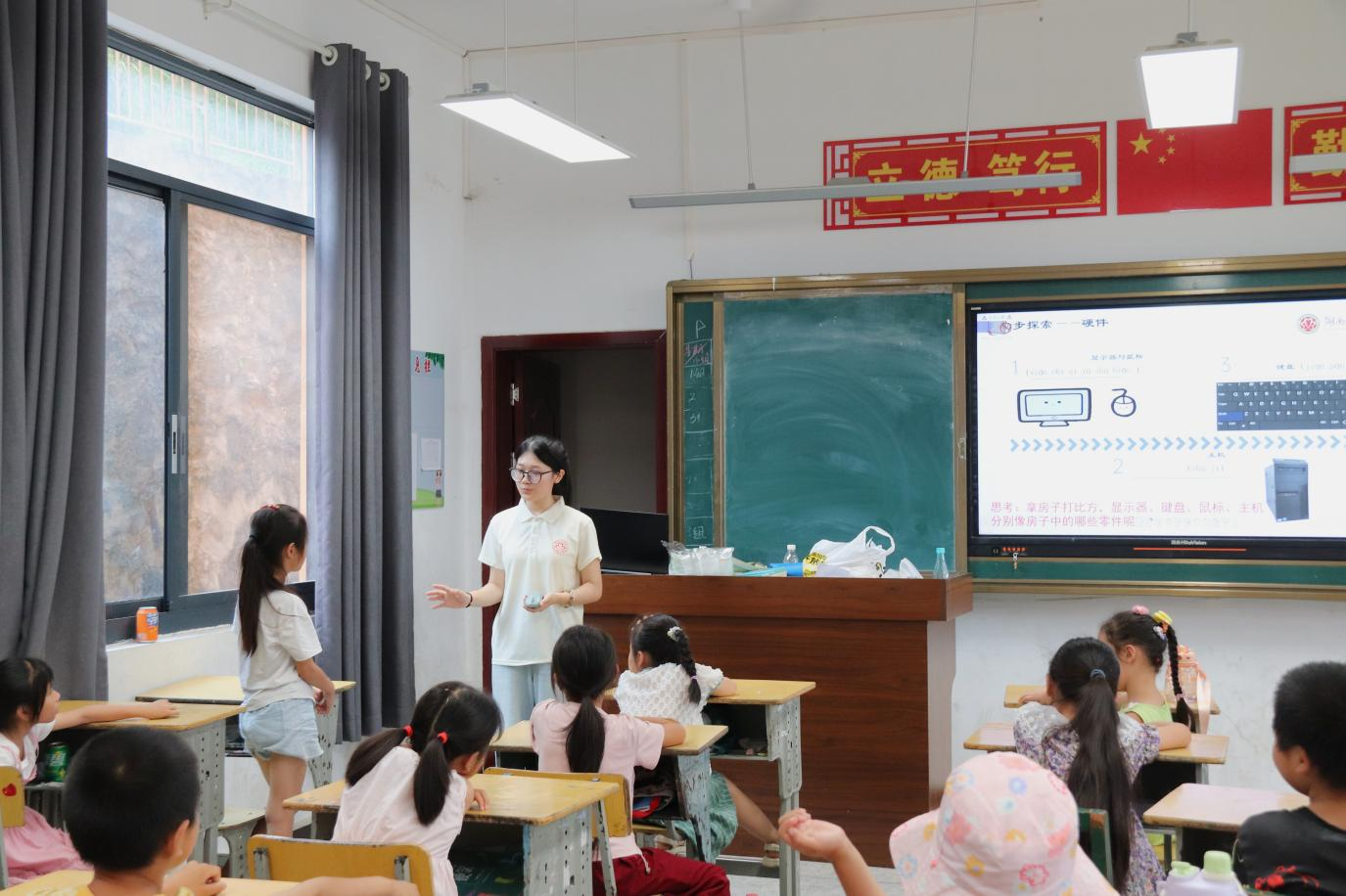 实践团创新打造“智启未来”课堂,主讲人邓子悦摒弃枯燥理论,将软件比作“会听话的小精灵”,通过趣味动画和通俗语言演绎“电脑魔法”,有效点燃乡村儿童对编程科技的好奇心与学习热情,生动践行了学校创新育人的理念。随后,实践团精心策划“快乐一夏”趣味运动会,“毛毛虫接力”“珠行万里”等趣味协作项目轮番登场,将校园变为活力四射的欢乐场。成员们与孩子们组队拼搏,烈日下并肩奔跑、默契协作,五年级学生小雅“平时很少有这样和大姐姐们一起玩的机会,太开心了!”的心声,道出了运动场上的童心共鸣。