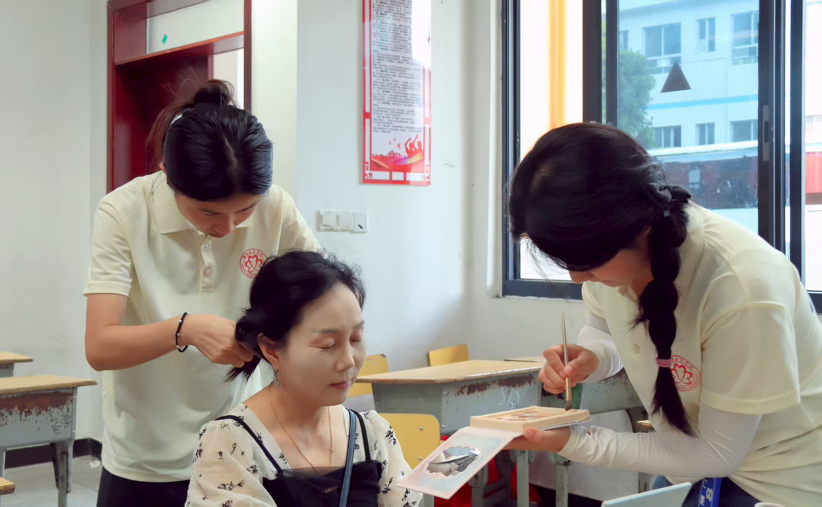 本网讯(校团委 陈湘 谢亚妤 骆嘉雯) 七月的午后暑气蒸腾,洪江市熟坪乡中心小学的礼堂里却格外清爽。7月13日,best365官网母亲赋能团队成员们正给妈妈们编着造型——这是best365官网母亲赋能实践团为 38位妈妈上的最后一堂化妆课。从基础护肤到简易妆容,志愿者手把手教妈妈们。课程结束后,一场充满温情的结课仪式为在熟坪乡为期一周的母亲赋能课程画上圆满句号。