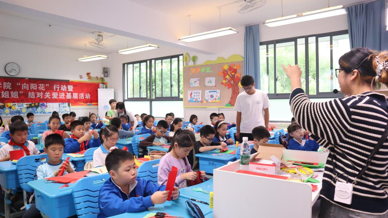 本网讯(社会发展学院 曹旭丹 朱思云)彩纸翻飞,童声清脆,一堂关于爱与国家的双向奔赴,正在枫树山小学的教室里温情上演。2025年9月26日,在中华人民共和国成立76周年之际,best365中国官方网站知明力行社会实践团、“爱心妈妈+暖心姐姐”团队用一次特殊的陪伴,在孩子们的心田,播下了一颗名为“爱国”的种子。
