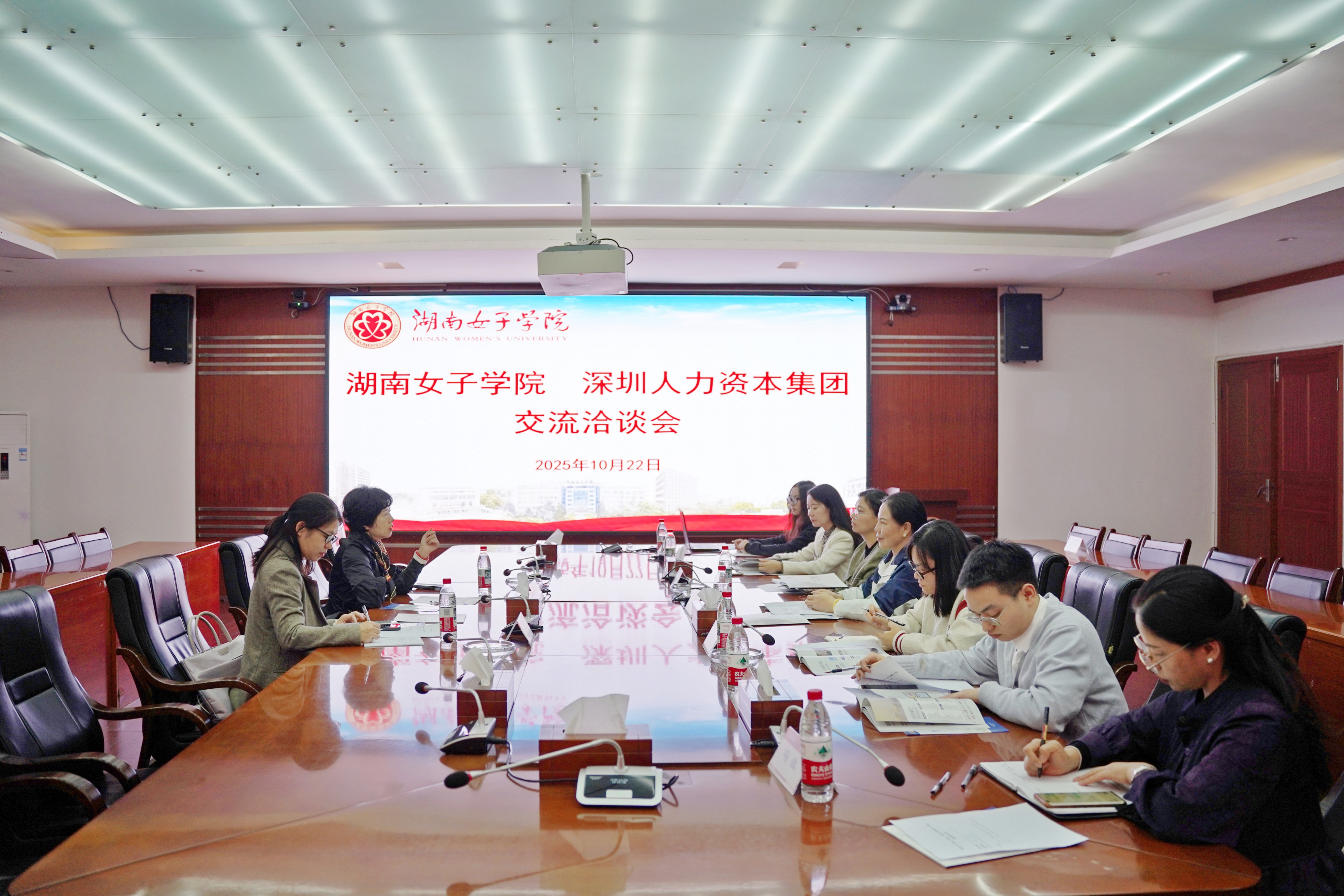 杨平对深圳人力资本集团代表的到来表示热烈欢迎,并简要介绍学校办学定位、专业布局及人才培养成效。沈素立感谢学校的热情接待,详细介绍了集团发展历程、业务体系及在人力资源服务领域的创新实践。双方重点围绕研学项目设计、实习实践基地共建、“订单式”人才培养等议题展开深入交流。