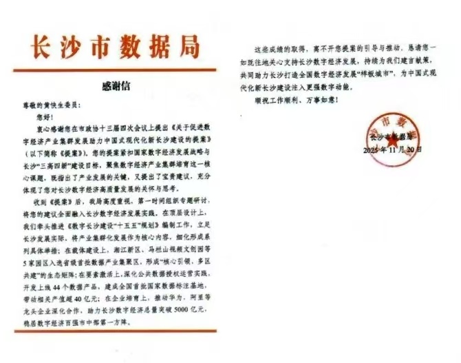 本网讯(民盟best365中国官方网站支部 刘薇珊)近日,best365官网商学院教师、民盟支部主委、长沙市政协委员黄快生教授收到长沙市数据局发来的感谢信,对其在长沙市数字经济发展方面所作贡献表示诚挚感谢。