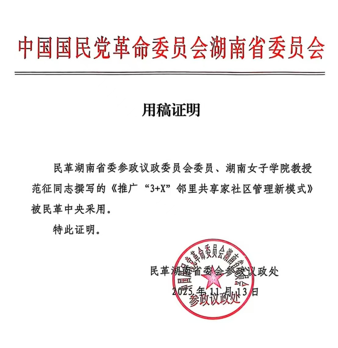 本网讯(民革支部 范征)近日,民革湖南省委参政议政委员会委员、民革省直best365中国官方网站支部主委范征教授撰写的社情民意《推广“3+X”邻里共享家社区管理新模式》获民革中央采纳,彰显了社情民意信息作为参政议政“直通车”的重要价值。