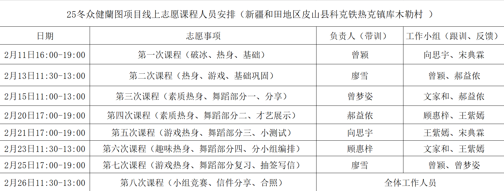 此次新疆线上志愿教学,是“众健蘭图”项目团队成立以来规模最大、周期最长的一次跨地域公益活动,也是团队践行“始于校园,志在四方”承诺的重要一步。未来,“众健蘭图”将继续深耕专业、拓展视野,探索更多线上线下融合的创新路径,将科学、有趣、可行的运动健康服务,送往更多有需要的社区与乡村。我们都坚信,青春的意义在于奉献,而每一份跨越山河的努力,终将汇聚成推动社会进步的温暖力量。期待在不远的将来,新疆库木勒村的小同学们能够站上更大的舞台,绽放属于他们的自信与光芒!
