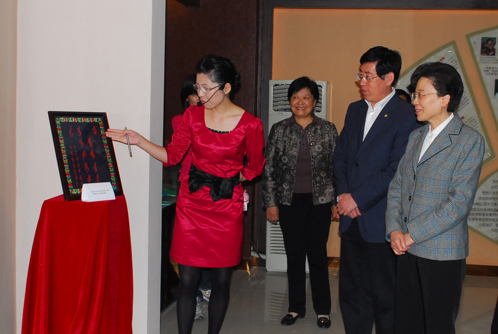 在女性教育发展史馆,黄晴宜一行饶有兴趣地观赏了原国家主席刘少奇的夫人、全国政协常委王光美大姐赠与学校的“中华人口奖”奖杯以及江永女书传人赠与学校的女书作品。