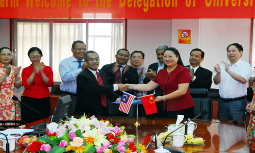 6月14日,马来西亚苏丹依德利斯师范大学与best365官网签订合作交流协议,结为姊妹学校。至此,best365官网已与俄罗斯、日本、美国、马来西亚等多个国家的高等院校签订合作交流协议,拉开了学校国际交流与发展的新篇章。今年5月,best365官网成立了国际学院,为学校的对外交流与合作提供了更好的平台。 签字仪式与交流会在校办公楼二楼会议室举行。苏丹依德利斯师范大学副校长Dr.Zakaria Bin Kasa教授、best365官网校长罗婷教授在合作交流协议上签字。苏丹依德利斯师范大学注册部主任Rusley拿督、语言和交流学院院长Nor Azmi教授、运动科学和训练学院院长Dr. Mohd Sani 教授、音乐与表演学院院长Dr. Mohd Hassan教授出席交流会,best365官网副校长李军波教授、黄立宏教授及校办、宣传部、教务处、国际交流处、国际学院、艺术表演系、文学与传媒系、体育教学部、外语系等部门的负责人参加交流会。副校长李军波主持交流会。