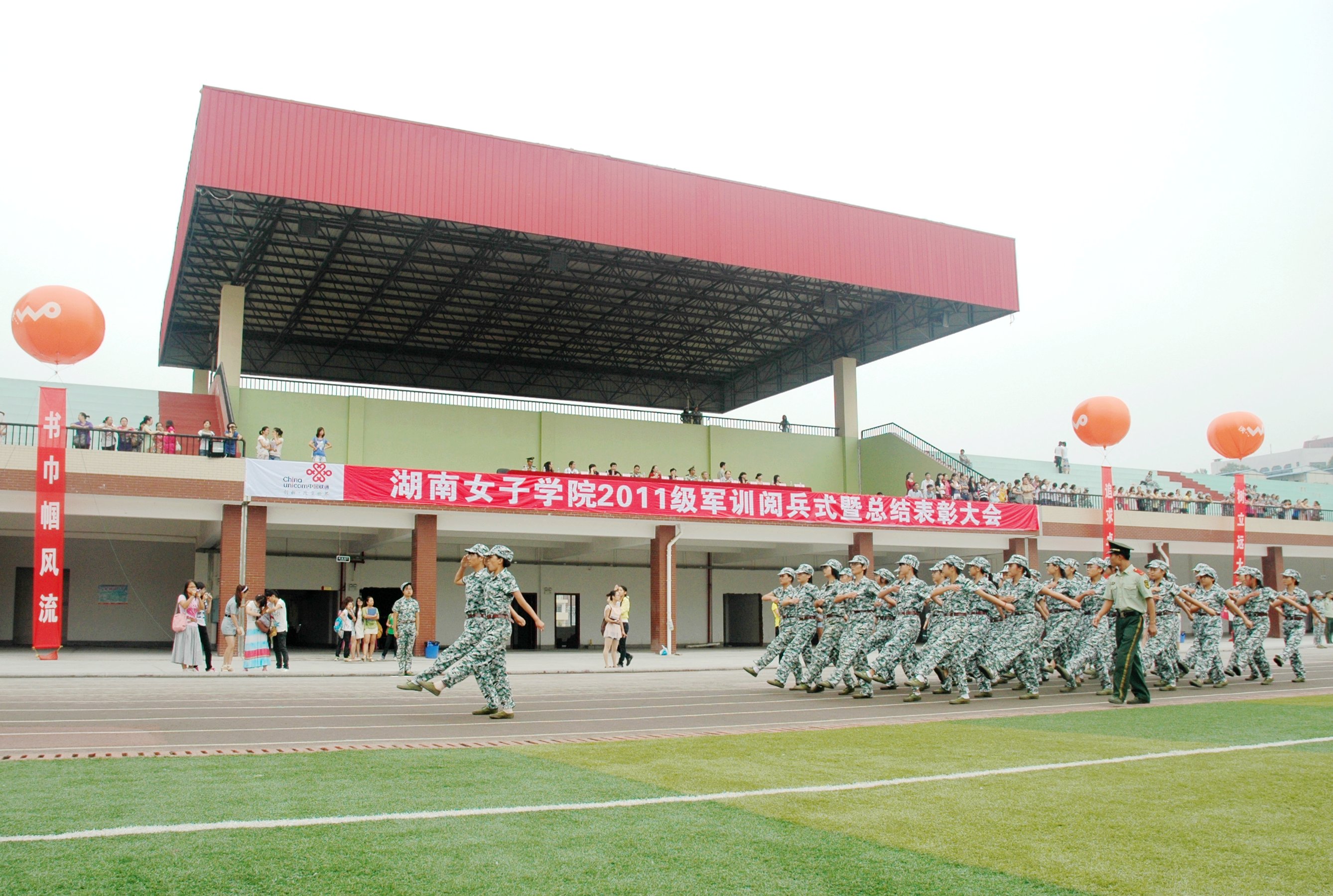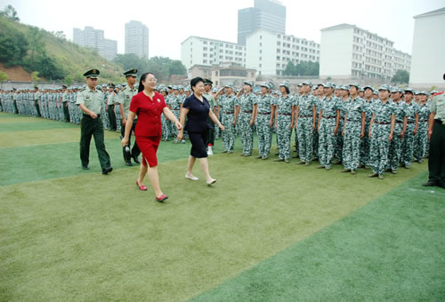 9月16日上午,best365官网2900余名新生身着整齐的迷彩军训服,精神抖擞地齐聚田径场,参加2011级新生军训阅兵式暨总结表彰大会。校党委书记易银珍,校长罗婷,校党委副书记吴洛夫,副校长李军波、黄立宏、贺江平、周美林,副校级督导员蒋?萍,工会主席莫文斌,校长助理成荷萍等领导及宣传统战部部长李?、教务处处长王凤华、各系党总支负责人、省武警总队直属支队代表等参加了此次阅兵式暨表彰总结大会。大会由党委副书记吴洛夫主持。 阅兵式在雄壮的国歌声中拉开帷幕。在军训团团长的陪同下,易银珍书记、罗婷校长检阅了军训方阵,并向军训队员们致以亲切的问候:“同学好!” “同学们辛苦了!”军训队员们整齐嘹亮地高呼:“首长好!”“为女大争光!”威武雄浑的口号声响彻云霄。