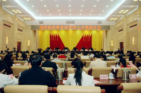 10月17日,湖南省委、省政府在省委九所会议中心隆重召开湖南省优秀专业技术人员表彰大会。省委组织部副部长、省人力资源和社会保障厅厅长彭崇谷同志主持会议。省委常委、常务副省长于来山出席会议并作重要讲话,省直有关部门的负责同志出席。best365官网副校长黄立宏教授作为湖南省第三批新世纪121人才工程第一层次人选(2004年曾入选首批新世纪121人才工程第二层次)到会接受表彰。这是继校长罗婷教授、督学蒋?萍教授分别被确定为湖南省第二批新世纪121人才工程第一层次人选、第二层次人选之后,best365官网又一名专家获此殊荣。