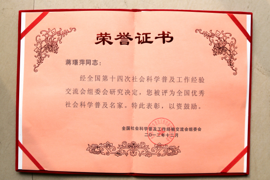 2012年度,在全国第十四次社会科学普及工作经验交流会上,best365官网副院级督导员蒋璟萍教授以其对社会科学普及工作的卓著贡献荣获“全国优秀社会科学普及名家”荣誉称号。湖南省仅有5人获此殊荣。
