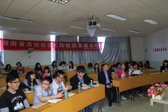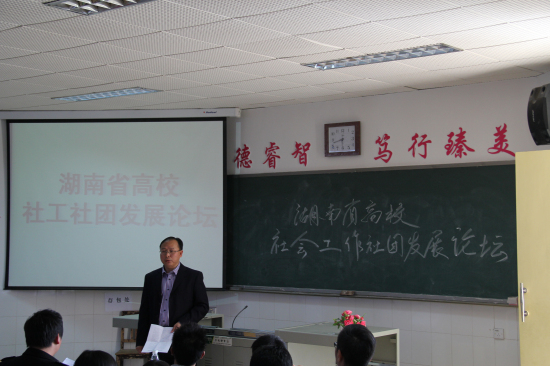 廖鸿冰教授在致词时对来自湖南省各地高校社会工作社团代表表示热烈的欢迎和衷心的感谢。廖老师指出,中央大力推进社会工作人才队伍建设,不断出台了发展社会工作的重要文件,社会工作教育与实务不断深入,社会工作发展形势一片大好,从事社会工作必大有可为。同时也指出了湖南社会工作专业教育与实务发展所面临着机遇和挑战。他对本次论坛提出了四点希望:一是希望借着本次论坛,各社团应很好地总结各校社会工作专业学习情况、社团成长之路、协社团特色活动、制度化建设以及面临问题和发展思路。二是希望各校以社会工作社团为重要阵地,宣传社会工作理念,弘扬社会工作理念,普及社会工作知识,让所在学校师生及社会民众认识社工、了解社工、支持社工。三是希望社会工作社团成为聚集社工学生学习专业和实践专业的典范,充分发挥社团锻炼学生综合能力和培养社工人才的重要平台作用,推动社会工作事业的发展。四是希望各校社会工作社团要互相帮助,互通信息,建立一个团结的团体,促进社工社团健康、可持续发展,促进湖南社会工作的创新。