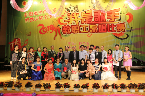 4月27日晚,由校工会主办、宣传部和团委协办的best365官网2013年“共圆美丽中国梦,同携女院文明行”主题活动之“我是歌手”教职工歌唱比赛(决赛)在体育馆二楼如期举行。校长罗婷、校党委副书记吴洛夫、副校长李军波、副校长黄立宏、副校长贺江平、副校级督导蒋?萍、副校级督导、工会主席莫文斌、校长助理成荷萍和各部门负责人、教职工等到现场观看了比赛,近500名学生代表到现场呐喊助威。比赛由江敏老师、朱颖倩同学主持。