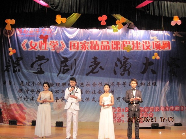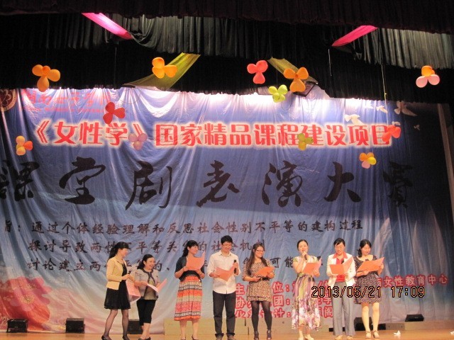 为推动学生对《女性学》课程的认识、提升全校社会性别意识,引导学生结合自身体验探讨和反思社会性别不平等关系的社会机制,5月21日下午,妇女/性别研究与女性教育中心在体育馆隆重举行了《女性学》国家精品课程建设项目课堂剧表演大赛。王琪教授、刘黎教授及女性学教研室全体教师为评委,副校长贺江平、周美林、教务处处长王凤华等出席观看了本次大赛。