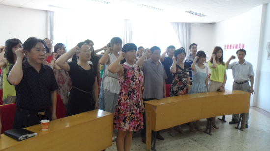 随后,全体师生党员在总支委员陈喜老师的领誓下,庄严地举起右手,在鲜艳的党旗下再一次重温誓词。激荡的声音久久在党员同志们的心中回响,一股激情和士气在入党誓词的重温中悄然增长。