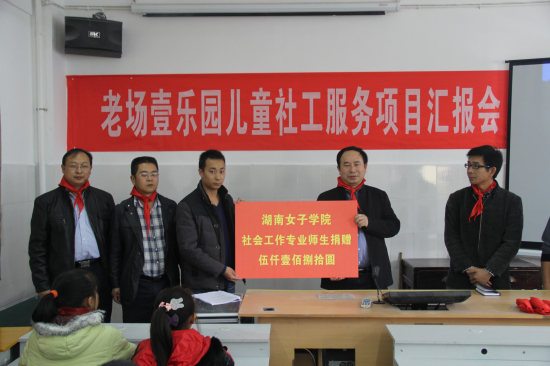 汇报会上,黄校长代表学校向老场小学捐赠了社会工作专业师生爱心款五千一百八十元,并对壹乐园儿童社工服务站的工作给予了充分肯定和高度评价。他指出,该项目所取得的成绩是壹基金的支持、老场乡党委的协助和老场小学的积极配合的结果,也是社工站的师生辛勤努力的结果。项目要多积累经验,靠成效赢得社会更多的认可。他说,壹乐园儿童社工服务项目在灾区的实施是best365官网社会工作专业在人才培养模式的探索,是社工学生践行专业理念、提升专业能力、在实践中成长的一个重要平台,是best365官网传承文化、服务社会、履行社会责任的具体体现。他提出了三点希望,一是希望社工教师积极探索社会工作专业人才培养模式,注重实践环节,强化学生的专业理念与专业技能的培养,为学生迅速进入专业领域打下良好的基础。二是希望壹乐园项目深化服务内涵,提升服务质量,实现项目管理规范化、专业化,不断积累儿童服务的经验,形成项目品牌效应与可借鉴的模式。三是希望老场乡政府和学校继续支持壹乐园项目,为项目实施提供指导,并进行监测与评估,确保项目按质按量完成。