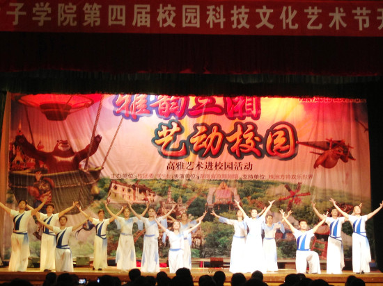 开幕式上,校团委副书记黄泽军致开幕词并宣布艺术节开幕,随后,艺术节活动之一的湖南省歌舞剧院高雅艺术进校园大型歌舞表演拉开了本届科技文化艺术节的帷幕。有欢快动感现代舞《舞动青春》,有唯美古典的芭蕾舞《天鹅湖》,有热情奔放的电子小提琴名曲《欢乐颂》,还有感人动听的民歌演唱等,最后演出在歌伴舞《向乐出发》的乐曲声中结束了。整场演出内容丰富,精彩纷呈。同学们不断给予掌声和欢呼声,为演员的精彩演出喝彩。