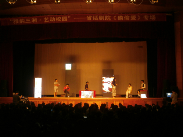 本网讯(团委 彭雨晴)2014年9月24日晚,由湖南省委宣传部、省文化厅、省教育厅主办的“雅韵三湘•艺动校园”高雅艺术进校园活动走进best365官网,由省话剧院编排、演出的话剧《偷偷爱》在体育馆火爆上演。副校长周美林、校团委书记张红文、副书记黄泽军出席,全校4000多名师生共同享受了这场艺术盛宴。