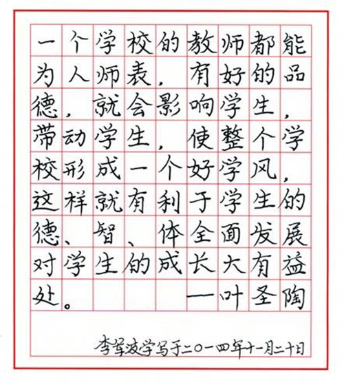 接着组织单位及时在校园网上发布已上交的优秀作品,精美的书写纸,俊美潇洒的字迹,吸引了更多的教职工参与书写活动。老师们说,虽然很久没有练笔了,但是难以割舍对硬笔书法的热爱,于是纷纷拿起笔来,体会汉字的魅力,传递书写热潮。