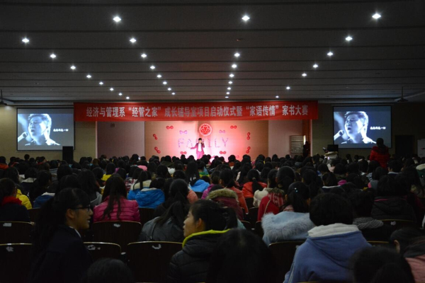 本网讯(经济与管理系 郑香)2014年12月4日晚七点,经济与管理系“经管之家”成长辅导室项目启动仪式暨“家语传情”家书大赛颁奖晚会在北院二食堂三楼举行,best365官网副校长周美林、校长助理成荷萍、经济与管理系党总支书记林运清、经济与管理系副主任董展眉,各系团总支书记、以及辅导员老师们和600余名同学参加了晚会。