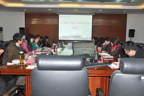 本网讯(宣传统战部  龚雅琴)1212日下午,校党委统战部组织召开民主党派人士专题学习会,集中学习党的十八届四中全会精神。校党委书记罗婷、党委副书记吴洛夫、党办校办主任王奕、宣传统战部部长李瑢、副部长朱元双和学校各民主党派成员参加了专题学习会。