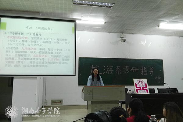 本次讲座邀请了湖南师范大学学科地理专业在读研究生2011级旅游管理班毕业生刘贵艳、被录取为湖南师范大学高等教育专业研究生2012级旅游管理一班谢康等两位同学为在校生做考研经验分享。刘贵艳、谢康分别从专业课备考和英语复习应考方法等方面作了相关指导。