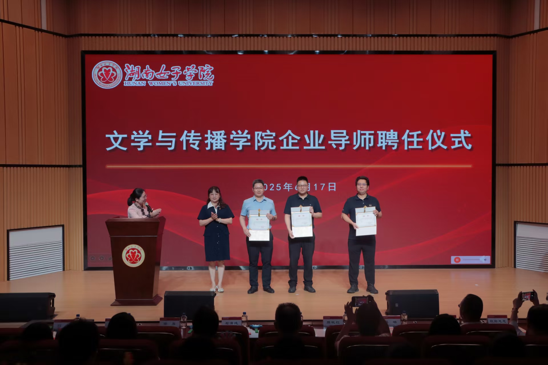 展映开场举行的企业导师聘任仪式成为焦点。长沙中电软件园有限公司董事长符昊、长沙中电软件园有限公司总经理邬勇、长沙中电软件园有限公司副总经理黎璐正式加盟学院企业导师团队,为传媒人才培养注入产业动能。“三位导师的加盟,标志着‘数字文化与科技传播产教融合示范基地’进入实操阶段。”文学与传播学院院长刘琼在聘任仪式中强调。