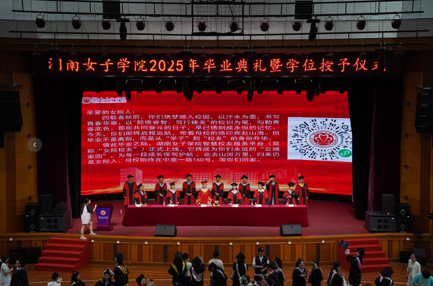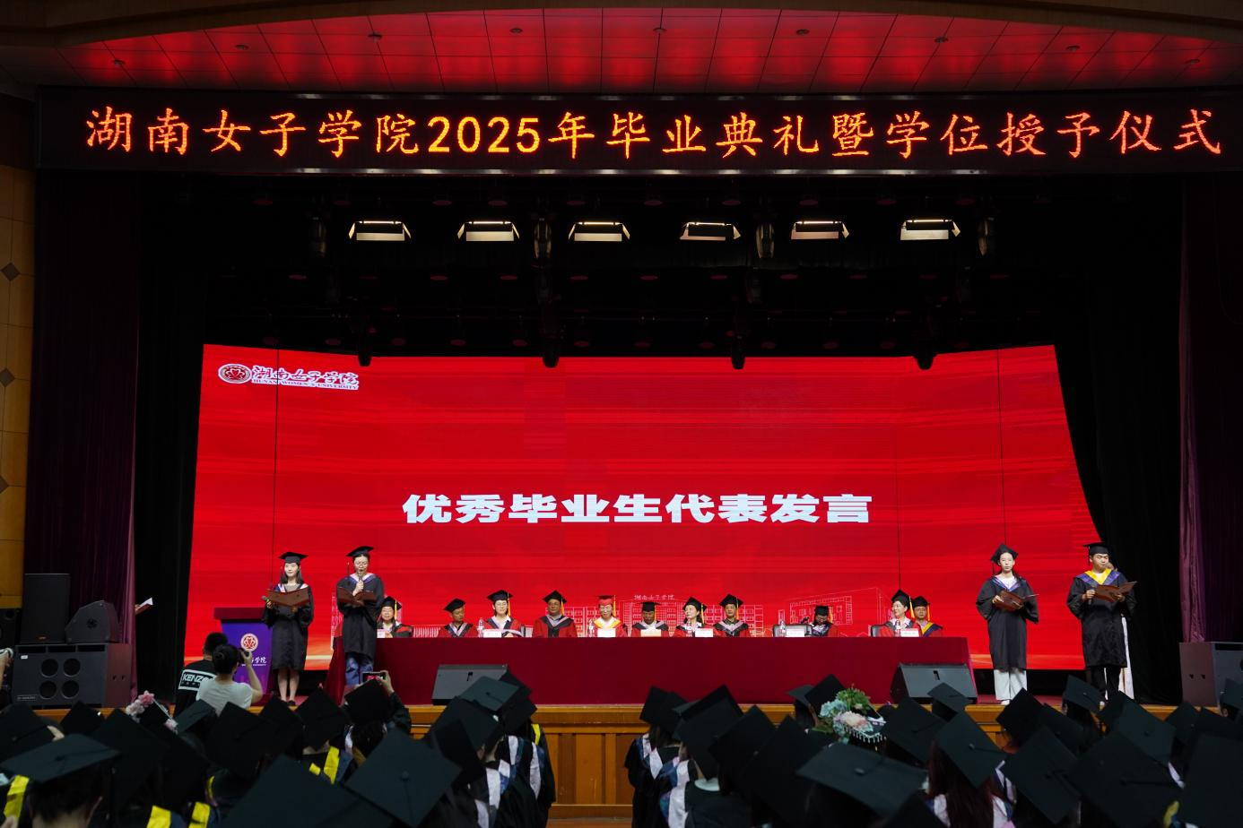 在校生代表,商学院22级市场营销2班刘舒婷为即将开启人生崭新篇章的2025届毕业生送上真诚而美好的祝福;优秀校友代表,商学院21届市场营销专业毕业生、住美整理创始人肖思嘉分享了自己的创业之途,勉励大家以强烈的责任心面对未来,以坚毅的勇气挑战未来,努力拥有一个充实、幸福、从容的人生;优秀毕业生家长代表熊铁辉先生以敬意感恩表达了对学校的感激之情、以回顾成长、寄语未来为即将踏入人生旅程的学子们送上美好祝愿;优秀毕业生代表王鑫哲、文峰、许依湉、周欣瑶分享了在女院四年学习成长的点滴,感恩学校的培养与关爱,未来将继承和发扬“懿德睿智 笃行臻美”的校训精神,不畏风雨,砥砺前行;美术与设计学院副院长易中华教授作为教师代表,回顾了大学四年同学们严谨求探、拼搏勇攀的求学历程,希望同学们用所学知识报效国家、服务人民,在推进强国建设、民族复兴伟业中展现青春作为、贡献青春力量。