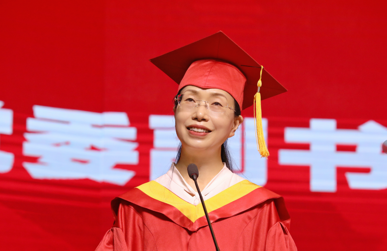 何旭娟作了题为“追光逐梦 挺膺担当”的讲话。她代表学校向顺利毕业、即将开启人生新篇章的全体毕业生,表示热烈的祝贺!勉励同学们要志存高远、脚踏实地,做有理想、敢担当、能吃苦、肯奋斗的新时代好青年,在各行各业中贡献女院力量, 奋力书写为中国式现代化挺膺担当的青春篇章,并以处理好“梦想与行动”的关系,始终逐光而行;处理好“热情与理性”的关系,始终积极进取;处理好“个人与团队”的关系,始终团结奋斗;处理好“付出与收获”的关系,始终不忘初心四组关键词之间的辩证关系,与大家分享了思考和感悟。