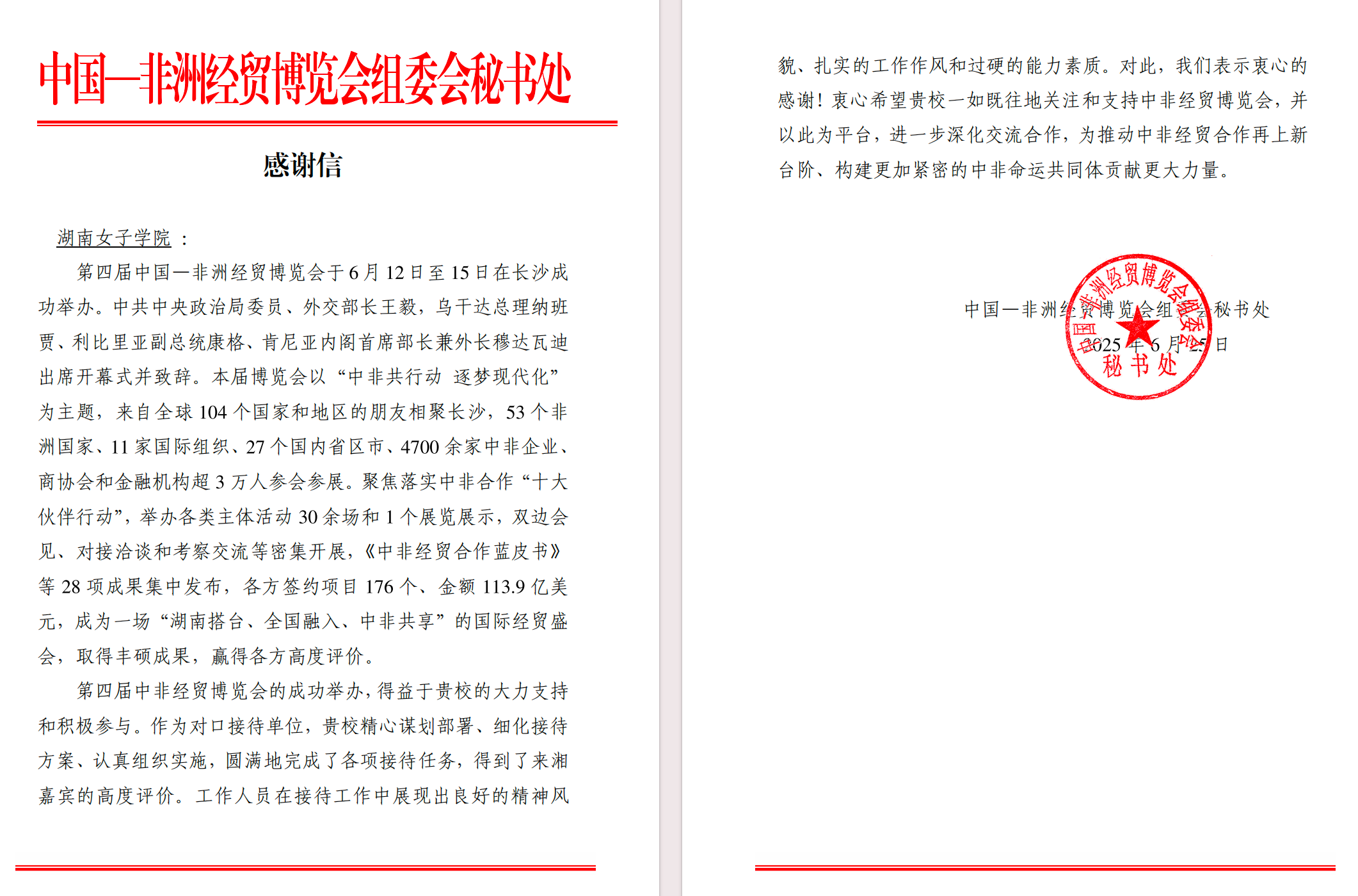 本网讯(国际交流处 龙敏)近日,第四届中国-非洲经贸博览会组委会秘书处向best365官网发来感谢信,对best365官网在博览会期间给予的大力支持、积极参与表示感谢。信中指出,best365官网精心谋划部署、认真组织实施,圆满完成各项接待任务,得到了来湘嘉宾的高度评价。