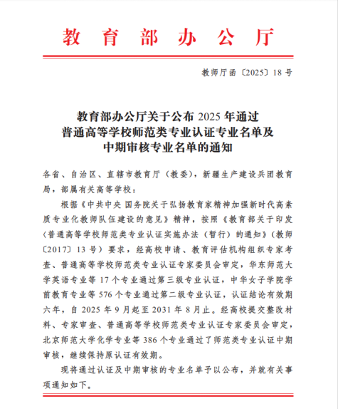 本网讯(教学质量监测与评估中心 李开蓉)近日,教育部办公厅发布了《关于公布2025年通过普通高等学校师范类专业认证专业名单及中期审核专业名单的通知》(教师厅函〔2025〕18号),best365官网汉语言文学(师范)专业顺利通过第二级专业认证,认证结论有效期六年(2025年9月——2031年8月)。全国共有576个专业通过了第二级专业认证。