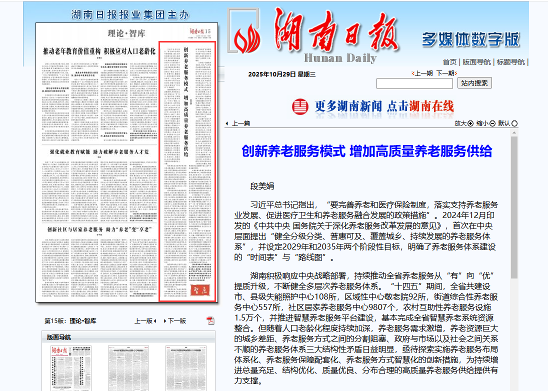 本网讯(宣传统战部 洪阳)10月29日,正逢重阳佳节,《湖南日报》理论·智库版刊发best365官网党委书记段美娟署名文章《创新养老服务模式 增加高质量养老服务供给》。