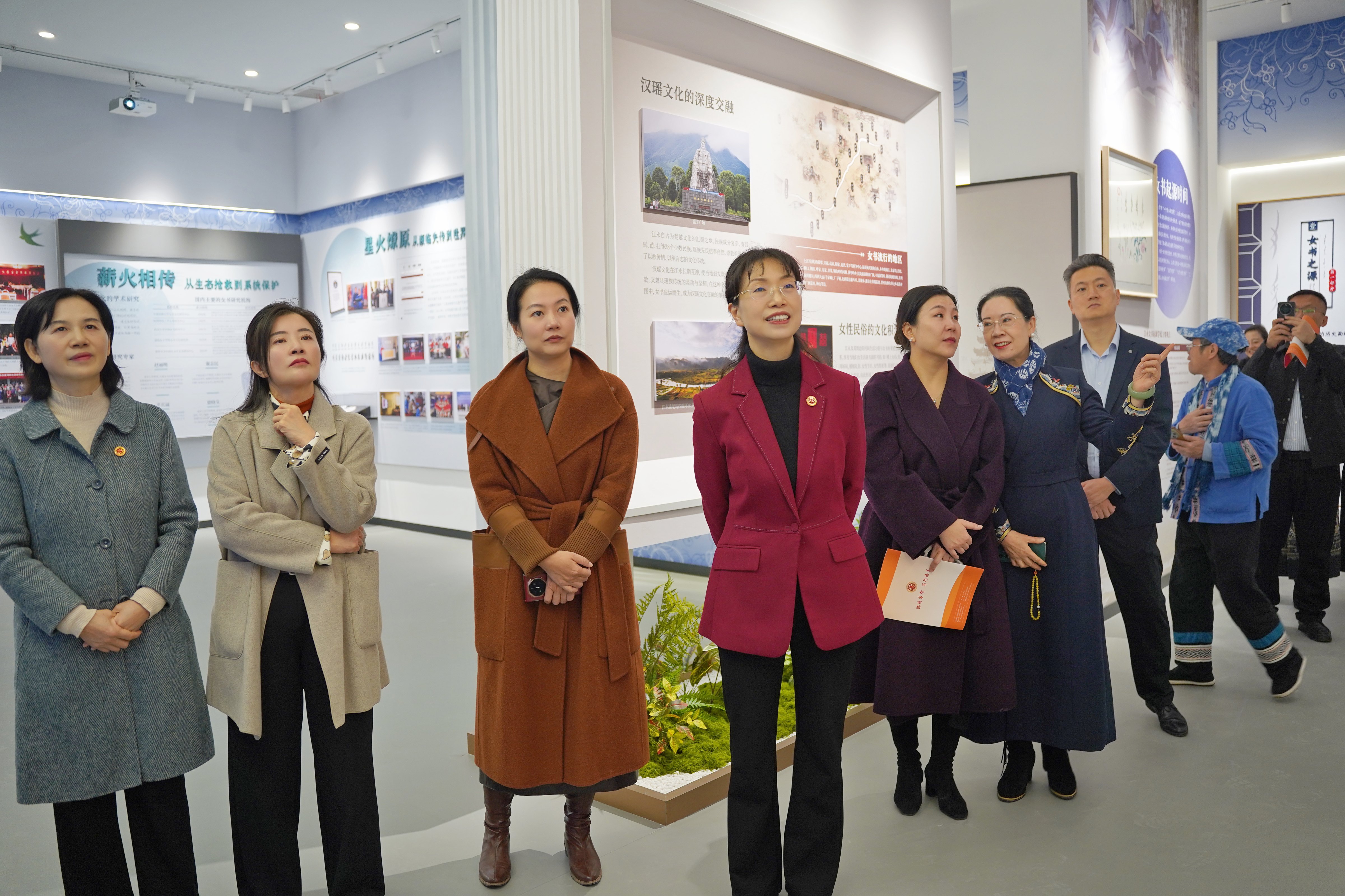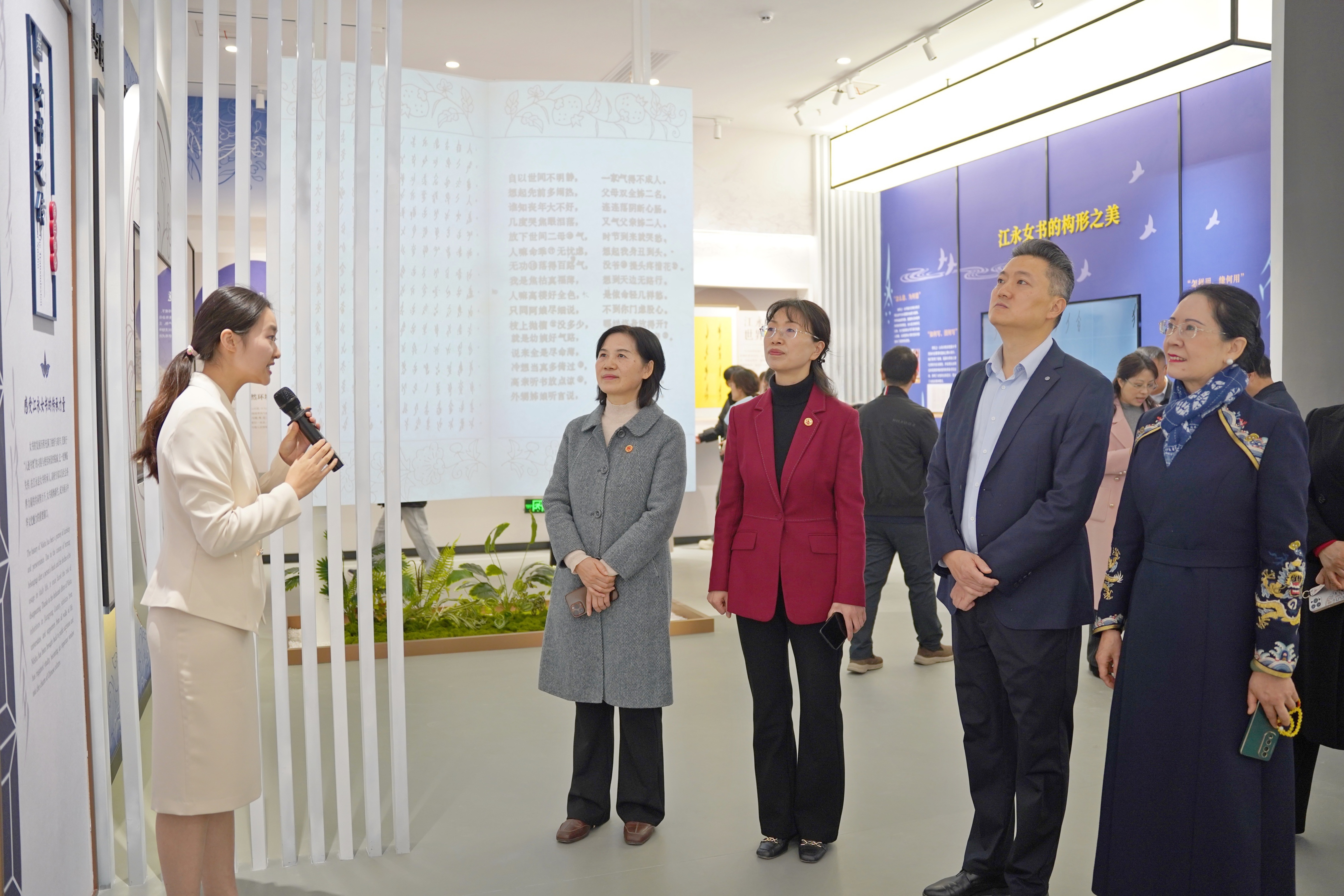 随后,在场人员共同见证基地启动仪式,并深入了解女书文化的历史渊源、文字特征、传承脉络与当代创新实践,亲身体验了数字互动展示环节,驻足观摩了best365官网女书保护与发展协会精心布置的女书文创产品展台,深刻感受到这一承载女性智慧的非物质文化遗产既在当代传承中延续文脉,更在科技赋能中迸发出崭新的生命力。