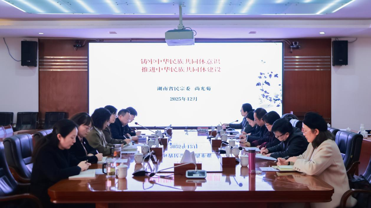 学习会特邀湖南省民宗委二级巡视员、协调推进处处长尚光菊作专题报告。尚光菊以“铸牢中华民族共同体意识 推进中华民族共同体建设”为主题,系统阐述了中华民族共同体的根脉魂脉与鲜明特征,深入解读了中华民族共同体意识的内涵与要求,并就如何全面推进中华民族共同体建设提出了具有针对性和指导性的建议。
