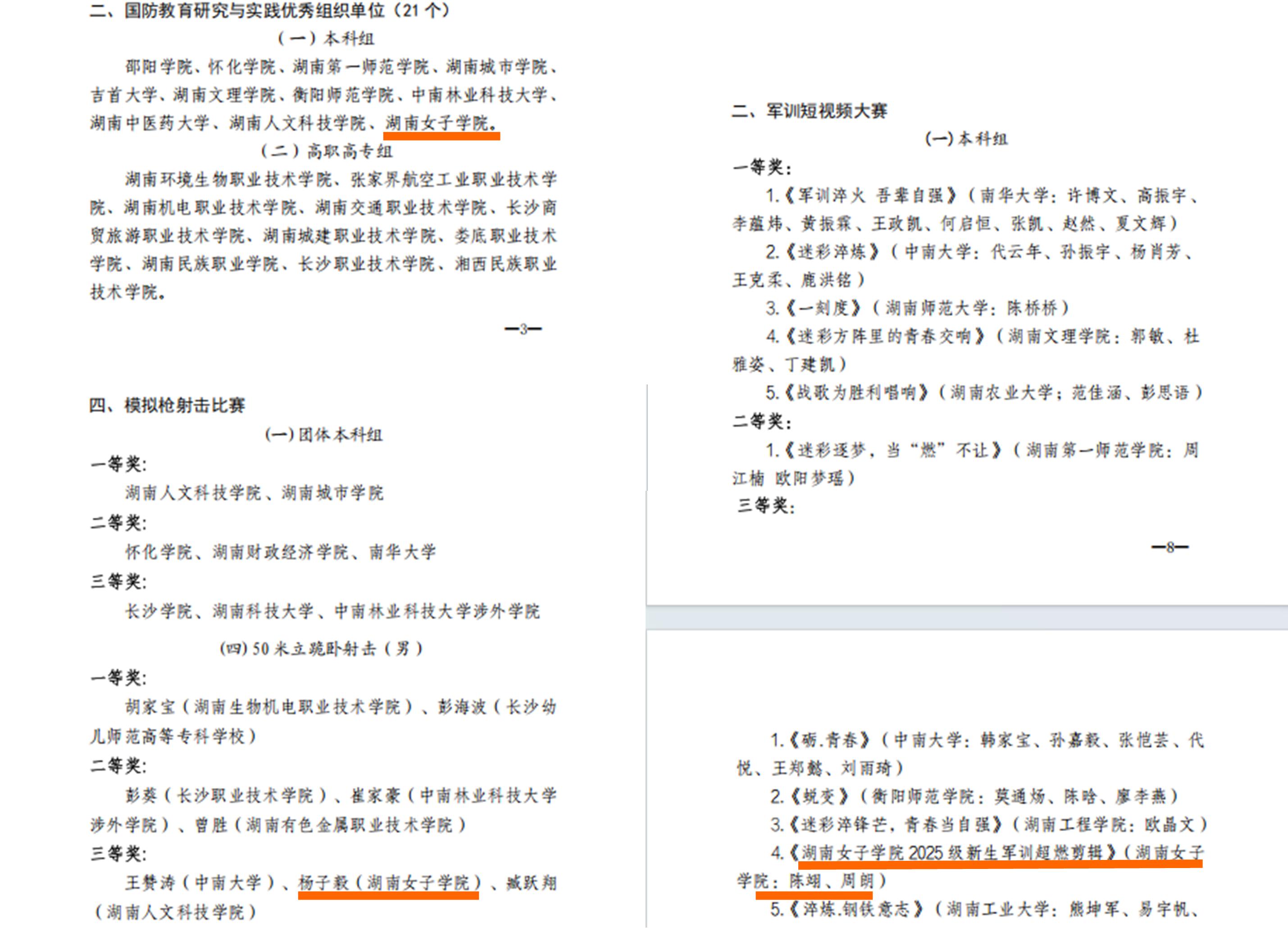 best365官网凭借规范的组织实施、丰硕的教育成果,荣获“湖南省国防教育研究与实践优秀组织单位”。师生团队凝心聚力、奋勇争先,在分项评比中争创佳绩:在军训短视频大赛中,作品《best365中国官方网站2025级新生军训超燃剪辑》荣获本科组三等奖,生动展现了女院学子在军训中的青春风采与坚韧意志;在模拟枪射击比赛50米立跪卧射击(男)项目中,杨子毅同学斩获三等奖,展现了良好的军事技能素养。
