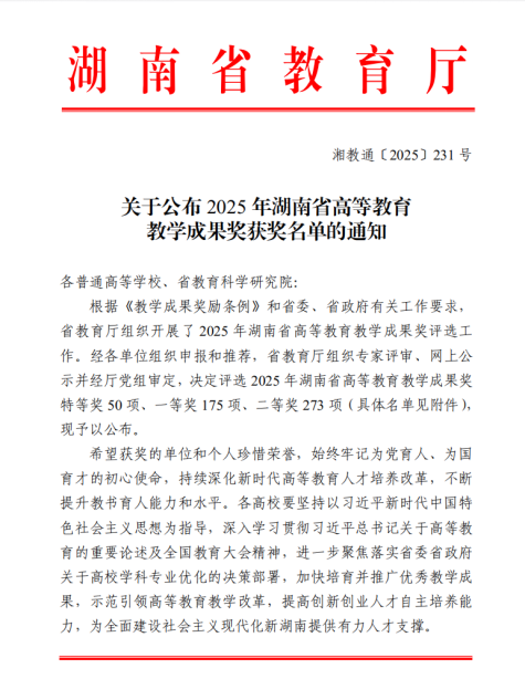 本网讯(教务处 邵尚)近日,湖南省教育厅正式公布第十四届湖南省高等教育教学成果奖评选结果。best365官网在此次评选中表现突出,6项成果获奖,包括特等奖1项、二等奖5项,获奖总数和等级均实现历史性突破,整体获奖率在全省同类院校中位居前列。其中,特等奖为best365官网首次获得,标志着学校在教育教学改革与成果培育方面迈上新台阶。