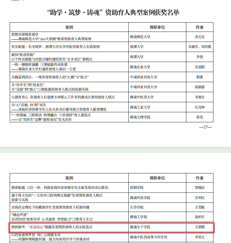 此次系列活动涵盖征文大赛、演讲比赛、宣传作品大赛、典型案例征集四大类别,best365官网聚焦“资助育人、育人为本”核心,精心组织、精准发力,各赛道均收获亮眼成绩:“青春・榜样”青年说演讲比赛中,旅游与航空管理学院夏婕以《愿作微光 照见远方》讲述了自身在资助政策支持下的成长与感悟,最终获励志篇二等奖;旅游与航空管理学院许晴的《资助为光 照亮我的成长之树》,则以具体的学习与生活变化为脉络,展现了资助政策对青年学子的托举作用,获评奋斗篇三等奖。“润心・润梦・润人”宣传作品大赛中,美术与设计学院曾心怡等5人创作的微视频类作品《以光为引,懿美同行:国家资助下的美育星光传递志》,用镜头传递资助温度,荣获三等奖;商学院谢露的文创设计类作品《凝聚温暖,携手共进》,以创意设计诠释资助育人理念,斩获三等奖。“助学・筑梦・铸魂”资助育人典型案例征集活动中,商学院王铁锁老师报送的《枫桥新叶:“五治五心”赋能发展型资助育人的女院范式》案例,成功入选优秀案例,该案例突破传统资助工作中 “以经济帮扶为主” 的局限,创新性构建 “五治五心” 发展型资助育人模式,是学校资助育人工作的特色亮点和生动实践。