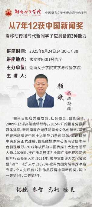 讲座主题:从7年12获中国新闻奖 看移动传播时代新闻学子应具备的3种能力 时 间:2025年9月24日14:30-17:30