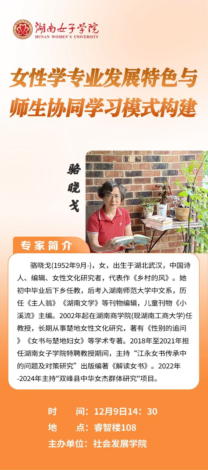 【讲座预告】女性学专业发展特色与师生协同学习模式构建